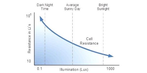 LDR (Light Dependent Resistance) is a variable resistance whose resistance changes according to the intensity of the light falling on it. The relationship between the resistance $ \mathbf{R}_{L} $ and light intensity Lux for a typical LDR is :