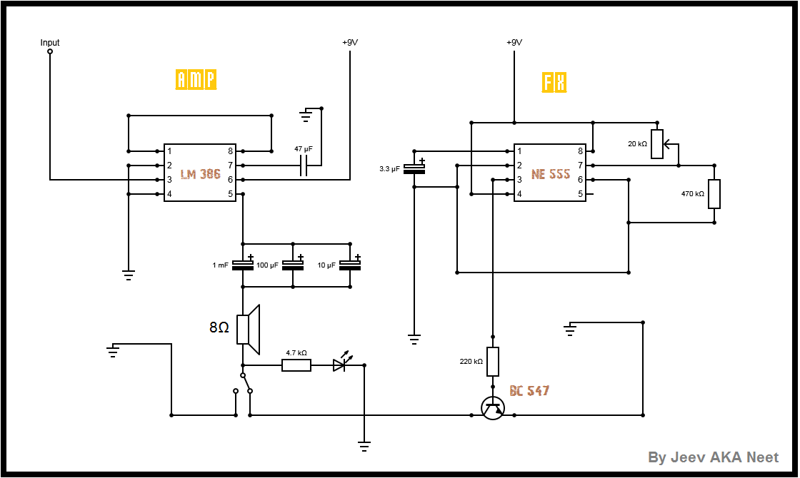 The values of the resistors and capacitors used can be changed as per your need. I used these values to acihive my desired sound.